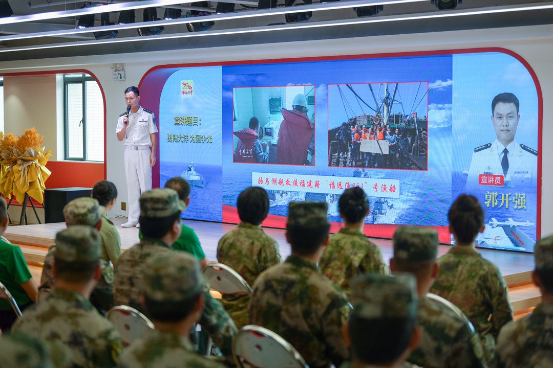 郭開強:勇闖大洋 為國爭光 2008年12月,應(yīng)聯(lián)合國授權(quán)請求,奉中央軍委命令,南海艦隊武漢艦、??谂灐⑽⑸胶灲M成第1批護(hù)航編隊,拉開了人民海軍舉世矚目的亞丁灣、索馬里護(hù)航序幕,這是自600多年前鄭和下西洋以來,中國真正意義上的遠(yuǎn)海非戰(zhàn)爭軍事行動,開啟了人民海軍從“黃水”駛向“藍(lán)水”的壯麗航程。 91878部隊郭開強干事為大家?guī)碇黝}宣講《勇闖大洋 為國爭光》。 郭開強介紹—— 迄今為止,人民海軍已累計派出44批100余艘次艦艇參加亞丁灣、索馬里海域護(hù)航,完成1500多批7000余艘中外船舶護(hù)航任務(wù),解救、接護(hù)各類船舶近百艘,其中外國船舶超過50%。 護(hù)航官兵一次次直面生死、一次次化解危機、一次次挑戰(zhàn)極限,用忠誠與奉獻(xiàn)、責(zé)任與擔(dān)當(dāng),彰顯大國海軍形象,譜寫了人民海軍邁向世界一流海軍的新時代壯歌。 張長城分享軍旅故事。記者 易承樂 攝