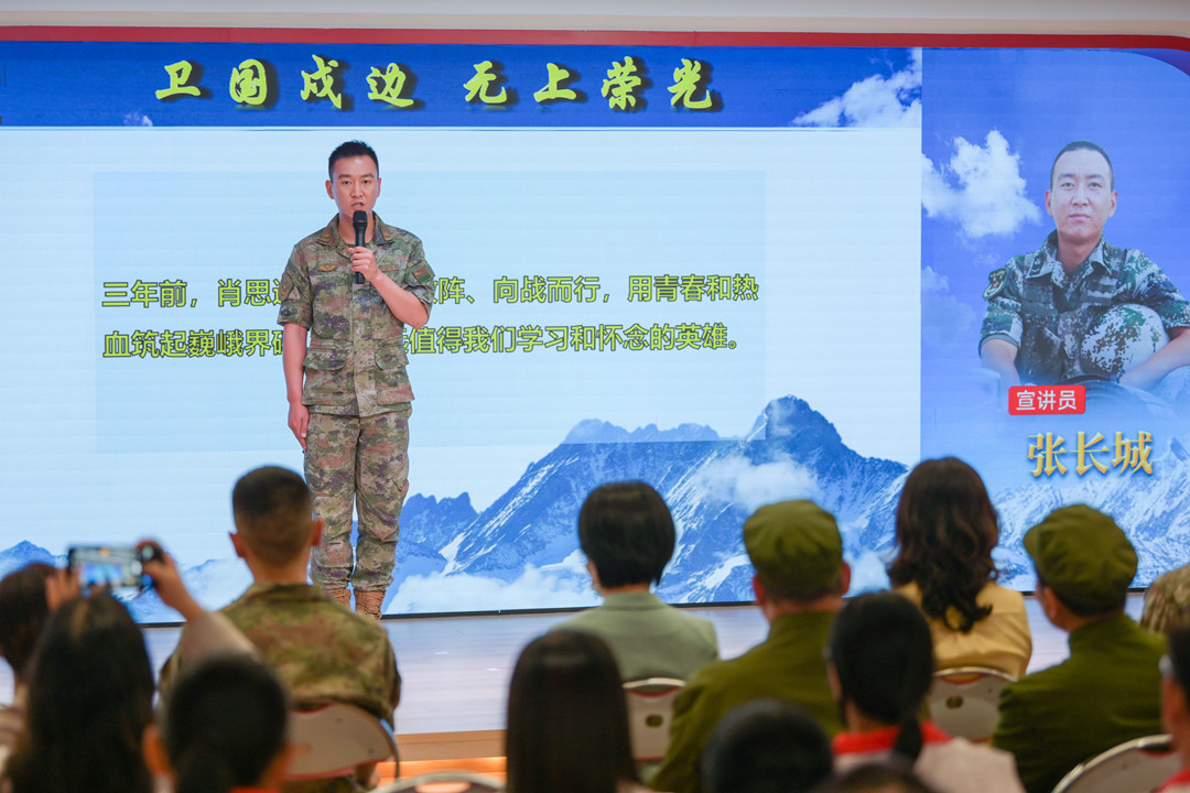 張長城:肖思遠(yuǎn)的名字永遠(yuǎn)留在連隊 “我是69316部隊加勒萬邊防連‘肖思遠(yuǎn)班’班長張長城,很高興今天有機會跟大家進(jìn)行交流。三年前,肖思遠(yuǎn)班長兩闖敵陣、向戰(zhàn)而行,用青春和熱血筑起巍峨界碑,是永遠(yuǎn)值得我們學(xué)習(xí)和懷念的英雄……” 張長城現(xiàn)場作了主題為《衛(wèi)國戍邊 無上榮光》的宣講。 張長城說—— 肖班長犧牲后,連隊組建了“肖思遠(yuǎn)班”,班里有一張肖班長的床,每天晚上,戰(zhàn)士們都會將肖班長的被子打開,早上起床再將被子工工整整的疊好;晚上點名,班里的同志輪流向肖班長匯報本班和個人的工作。 連隊每天的點名,呼點的第一個名字永遠(yuǎn)是“肖思遠(yuǎn)”,全連齊聲答“到、到、到”,那一刻,感覺下面所有人,望過去都是他! ▌與現(xiàn)場基層干部群眾互動交流