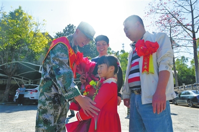 葉陽浩、胡家威兩名準(zhǔn)新兵身披“光榮入伍”的紅色綬帶和大紅花昂首挺胸站在太陽下,新兵家屬前來歡送。“陽浩的堂叔叔、外公和叔公都曾應(yīng)征入伍,他能進(jìn)部隊(duì)得到鍛煉,我們作為他的父母感到很光榮、很幸福?!比~陽浩的父母胸戴“光榮家屬”的大紅花,激動(dòng)地說。