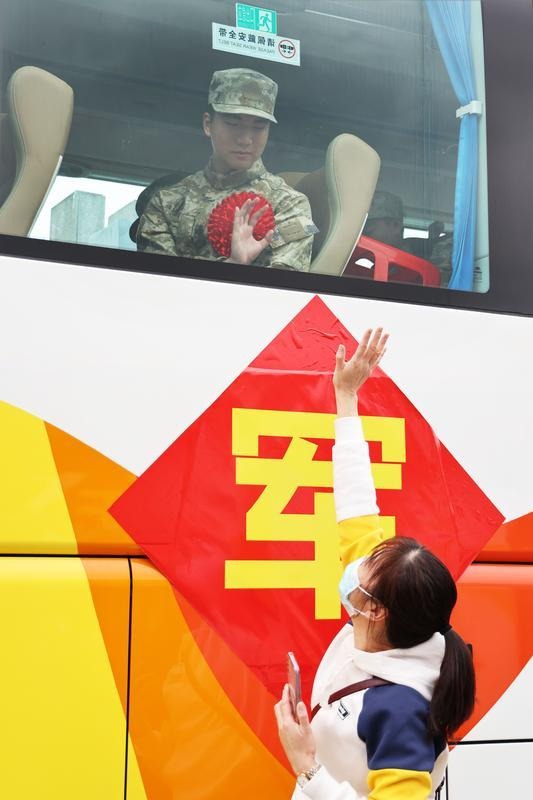 滿載著新兵的客車徐徐駛離。記者 文波 攝