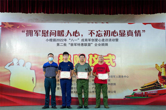 7月24日,小欖鎮(zhèn)舉行“擁軍慰問暖人心,不忘初心顯真情”——2022年“八一”愛心走訪活動啟動暨第二批“崇軍特惠聯(lián)盟”企業(yè)頒牌儀式。該鎮(zhèn)副鎮(zhèn)長鄧泳標、市退役軍人服務(wù)中心副主任高亞男及鎮(zhèn)公共服務(wù)辦、退役軍人服務(wù)中心、高沙社區(qū)、中山好人工作室相關(guān)負責(zé)人,小欖愛心助學(xué)團志愿者、愛心企業(yè)及第二批市“崇軍特惠聯(lián)盟”企業(yè)的代表以及部分優(yōu)秀退役軍人代表近100人參加了活動。
