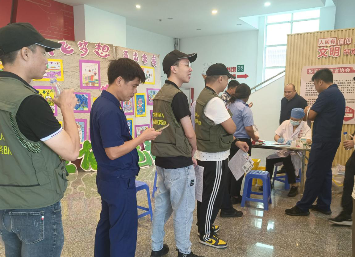 板芙鎮(zhèn)退役軍人紅旗志愿服務(wù)隊(duì)隊(duì)員排隊(duì)等候無償獻(xiàn)血。