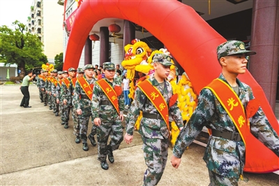 新兵們身穿戎裝、肩披紅綬帶,整齊列隊(duì)奔赴軍營。通訊員供圖