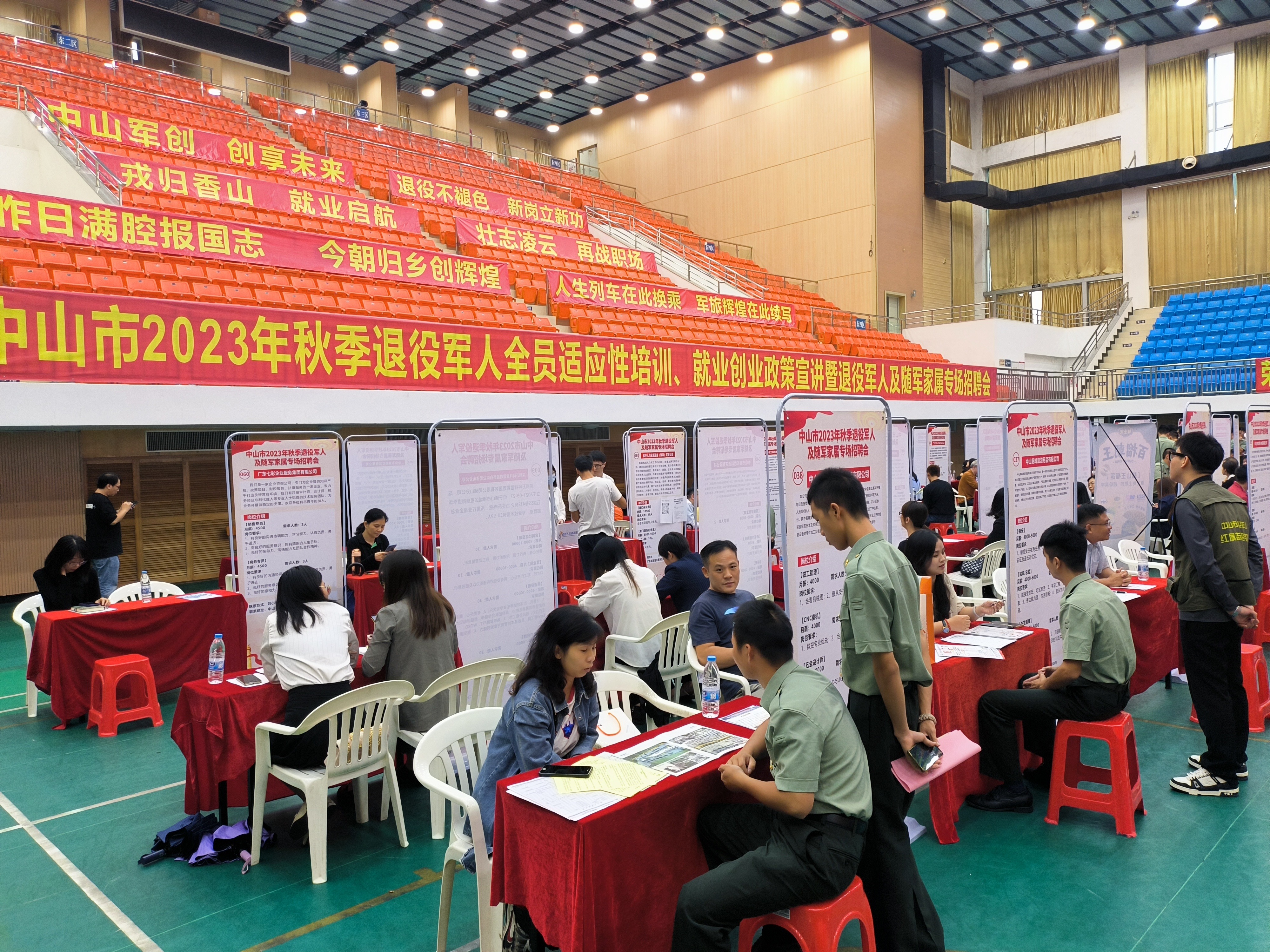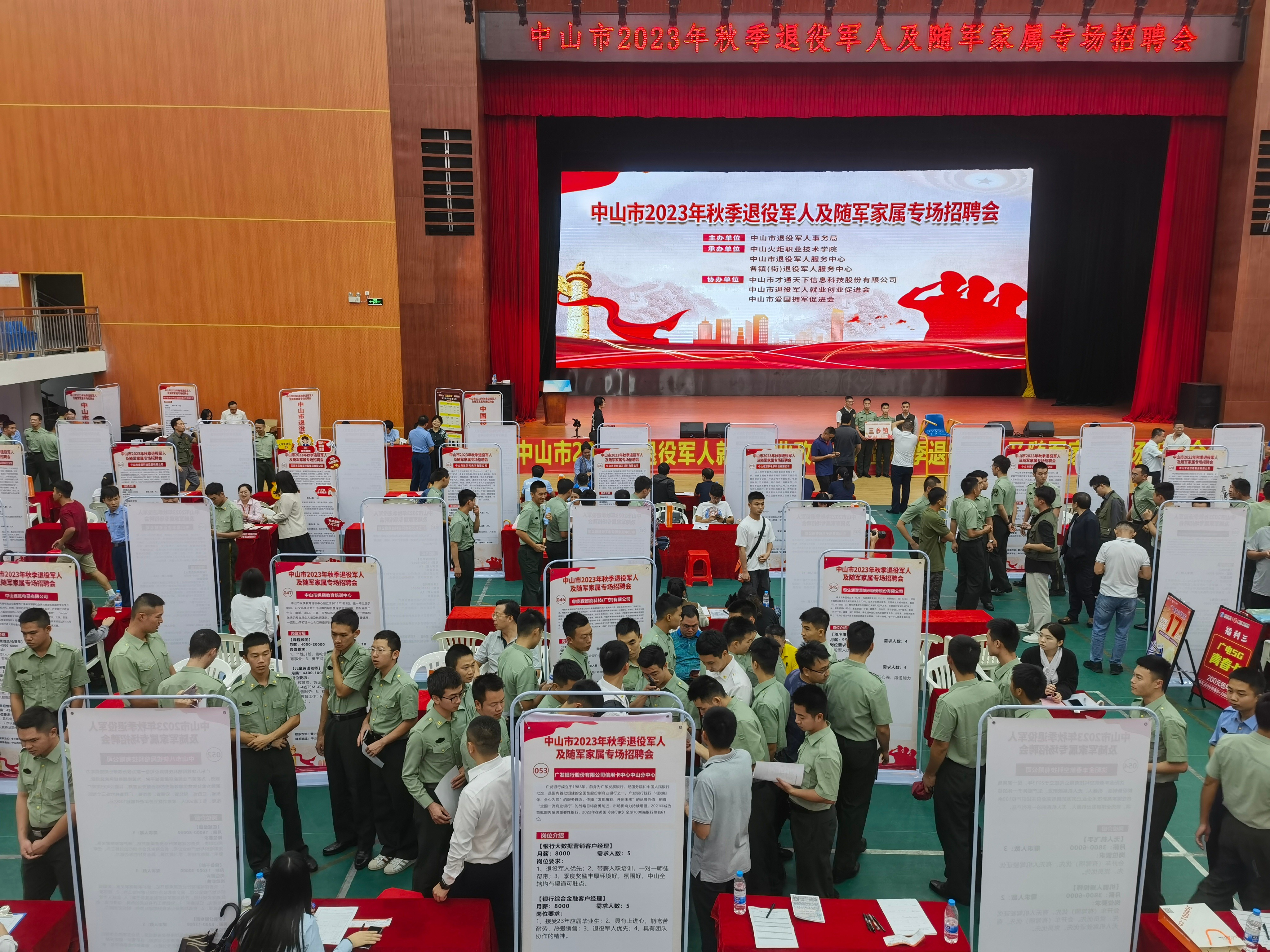 中山市2023年秋季退役軍人及隨軍家屬專場招聘會現(xiàn)場。(市退役軍人事務(wù)局供圖) 為深入開展“我為群眾辦實事”實踐活動,推動主題教育走深走實、見行見效,10月20日下午,中山市2023年秋季退役軍人及隨軍家屬專場招聘會在中山火炬職業(yè)技術(shù)學(xué)院體育館成功舉辦。專場招聘會由中山市退役軍人事務(wù)局主辦,中山火炬職業(yè)技術(shù)學(xué)院、中山市退役軍人服務(wù)中心、各鎮(zhèn)(街)退役軍人服務(wù)中心承辦,中山市才通天下信息科技股份有限公司、中山市退役軍人就業(yè)創(chuàng)業(yè)促進(jìn)會、中山市愛國擁軍促進(jìn)會協(xié)辦。