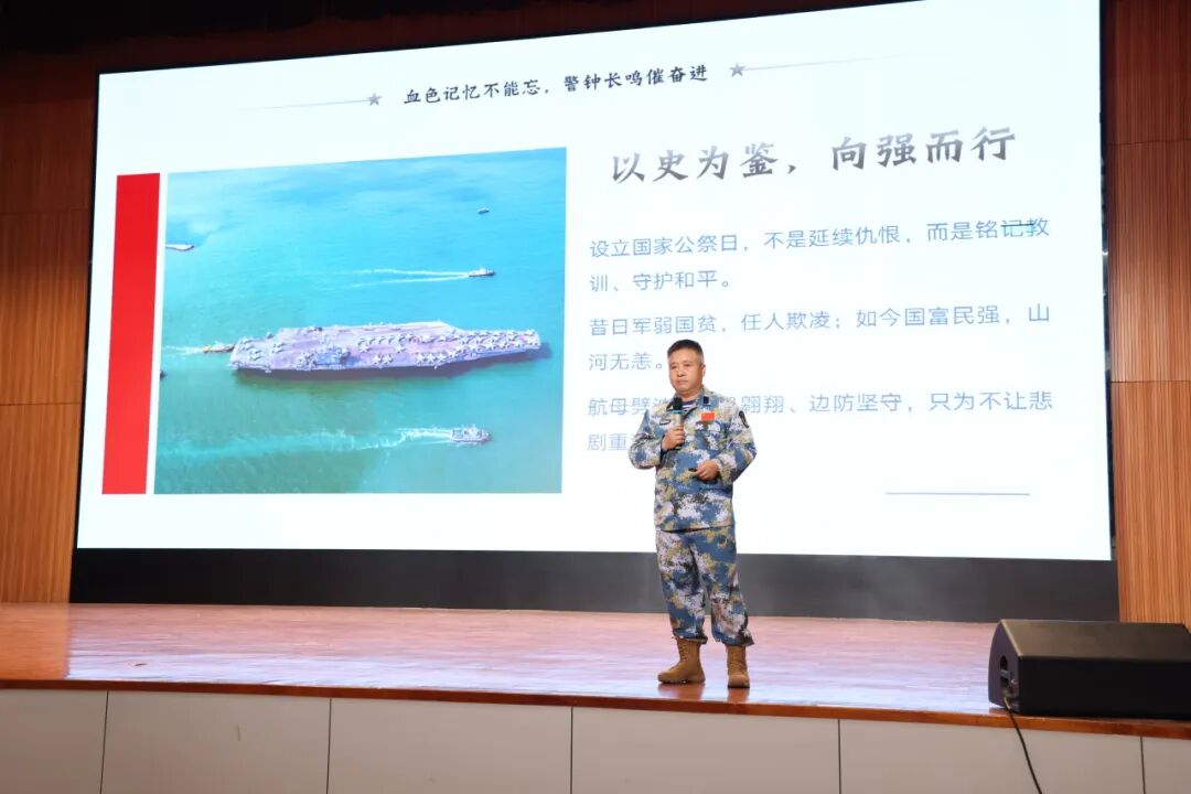 活動邀請中山港口鎮(zhèn)人民武裝部副部長賀洪彪以《銘記歷史守海疆 青春立志報家國》為題開展專題講座,帶領(lǐng)師生重溫南京大屠殺那段山河破碎的屈辱歷史,闡釋國家公祭日的設(shè)立意義,讓師生深刻理解“銘記歷史、勿忘國恥”的意義。現(xiàn)場莊嚴(yán)肅穆,全體師生為南京大屠殺死難同胞默哀,用無聲的敬意寄托對逝者的哀思。 會上,賀洪彪結(jié)合自身十五載南沙守礁經(jīng)歷,講述“以礁為家、以苦為榮”的崢嶸歲月,用軍人的忠誠與信仰,詮釋新時代國防衛(wèi)士守護家國的責(zé)任擔(dān)當(dāng),讓師生們真切感受到和平生活的來之不易。