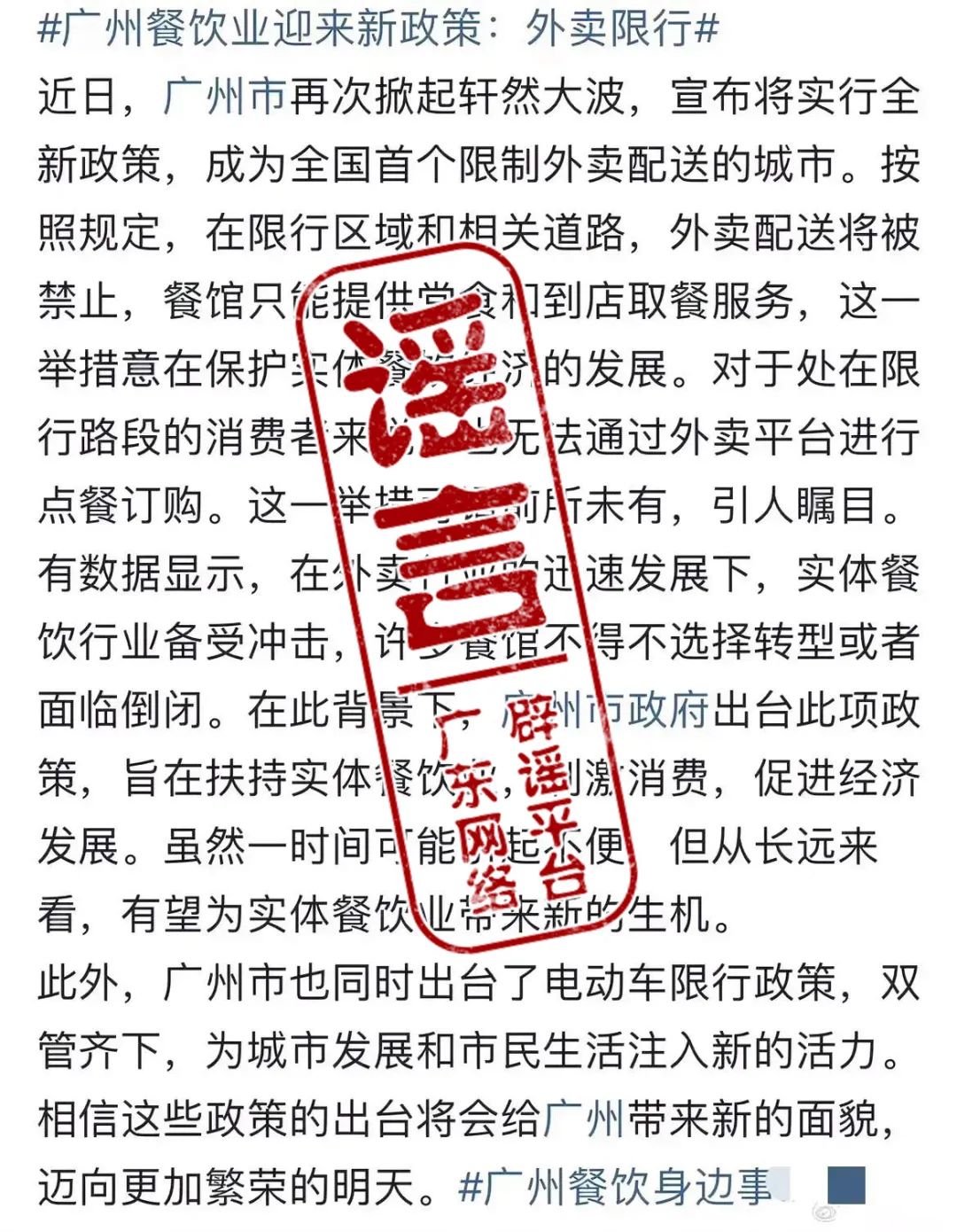 近日,有自媒體發(fā)布“廣州市將實行全新政策,成為全國首個限制外賣配送的城市”“限行區(qū)域和相關(guān)道路,外賣配送將被禁止,餐館只能提供堂食和到店取餐服務(wù)”,經(jīng)核查,上述信息嚴(yán)重不實,惡意曲解廣州電動自行車限行新規(guī),誤導(dǎo)民眾,引發(fā)不良社會影響。