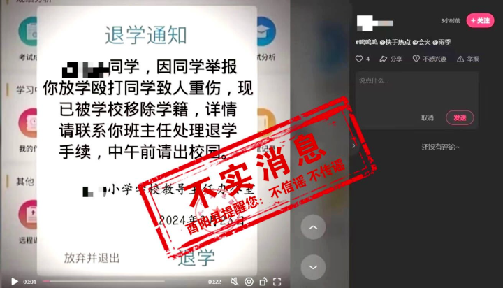 無獨(dú)有偶,近期重慶酉陽縣某小學(xué)一學(xué)生也對(duì)這則謠言進(jìn)行“模仿秀”,在網(wǎng)上惡搞“克隆”出“退學(xué)通知”,并以學(xué)校名義署名落款。相關(guān)謠言在網(wǎng)上傳播后引發(fā)議論。目前,這則謠言已被刪除,學(xué)校對(duì)該學(xué)生進(jìn)行了批評(píng)教育。