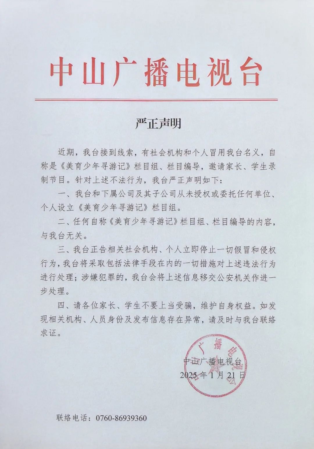 針對《美育少年尋游記》欄目組的不法行為,中山廣播電視臺在此發(fā)出嚴(yán)正聲明: