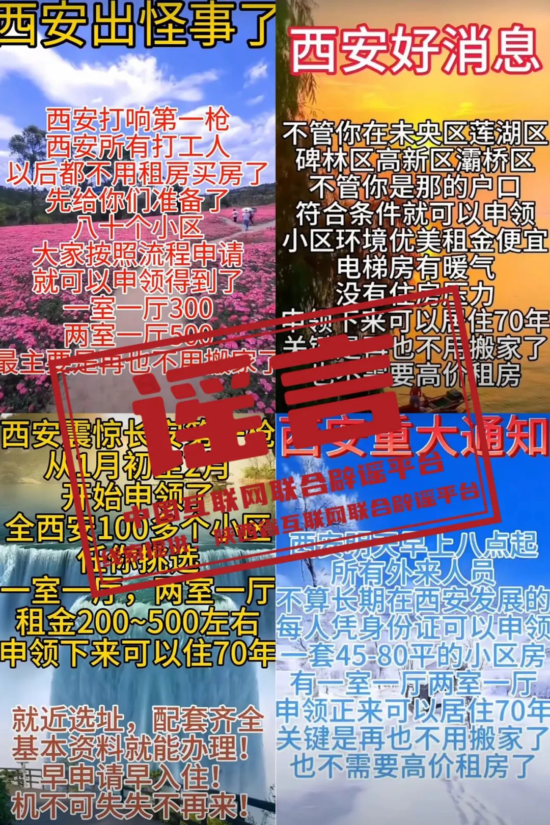 真相:近期,自媒體平臺上出現(xiàn)以“西安緊急通知”“西安出怪事了”等夸大性、煽動性話語為標(biāo)題,散播“憑身份證就可申領(lǐng)”“全西安市100多個小區(qū)任你挑選”“一次申領(lǐng)可以一直居住”等模糊性、誘導(dǎo)性內(nèi)容的信息。對此,西安市保障性住房管理中心發(fā)布聲明回應(yīng)稱,以上內(nèi)容均為不實信息,是對西安市公租房政策的歪曲理解和斷章取義。該聲明還特別提醒網(wǎng)民:有關(guān)西安市保障房政策、房源等相關(guān)信息,均以西安市住建局官方媒體發(fā)布的信息為準。(來源:陜西省互聯(lián)網(wǎng)聯(lián)合辟謠平臺、“西安住建”微信公眾號)