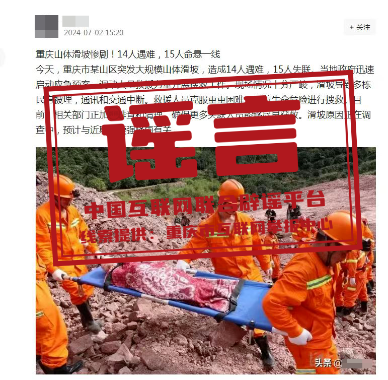 真相:7月2日,某網(wǎng)民發(fā)布信息稱,“重慶市某山區(qū)突發(fā)大規(guī)模山體滑坡,造成14人遇難,15人失聯(lián)。”經(jīng)相關(guān)部門核實,重慶近日未發(fā)生相關(guān)地質(zhì)災(zāi)害,網(wǎng)傳信息系謠言。(來源:重慶辟謠)