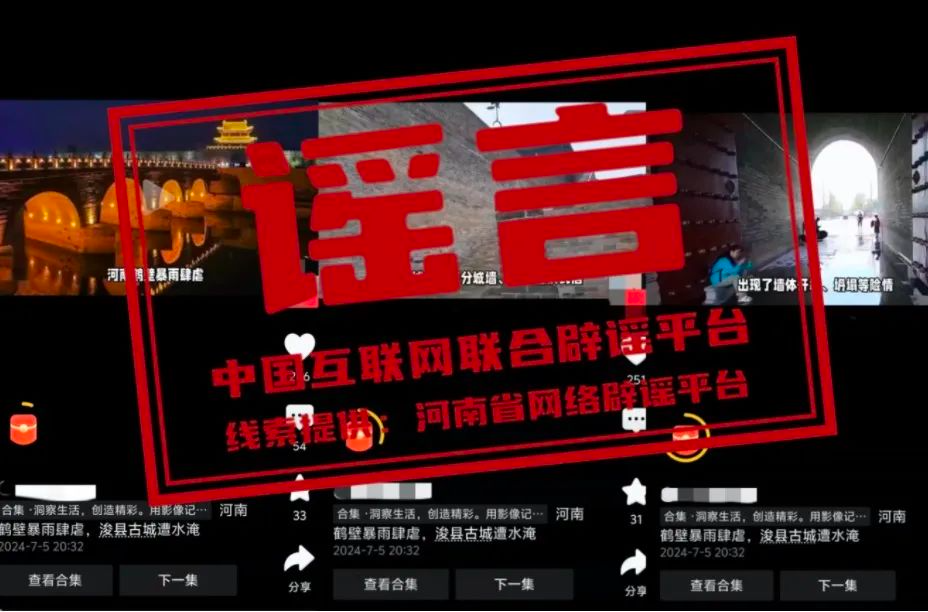 真相:近日,有網(wǎng)民在網(wǎng)絡(luò)平臺(tái)發(fā)布內(nèi)容為“河南鶴壁暴雨肆虐,浚縣古城遭水淹”的視頻信息,引發(fā)社會(huì)關(guān)注。經(jīng)核實(shí),7月5日??h出現(xiàn)暴雨天氣,強(qiáng)降雨期間浚縣古城北大街、東城門廣場(chǎng)等處出現(xiàn)積水情況,經(jīng)過積極排澇,雨停后路面積水很快被排空,恢復(fù)正常通行,不存在視頻中所說的“古城風(fēng)貌受損嚴(yán)重”“古城內(nèi)的部分城墻、古街巷出現(xiàn)不同程度的損毀”“古城墻出現(xiàn)了墻體開裂、坍塌等險(xiǎn)情”“古城內(nèi)的博物館、紀(jì)念館等文化設(shè)施也遭受不同程度的損失”等現(xiàn)象。該視頻多為當(dāng)?shù)嘏f聞及外地視頻嫁接拼湊。目前,??h古城秩序正常。(來源:河南省網(wǎng)絡(luò)辟謠平臺(tái)、??h古城保護(hù)建設(shè)服務(wù)中心)