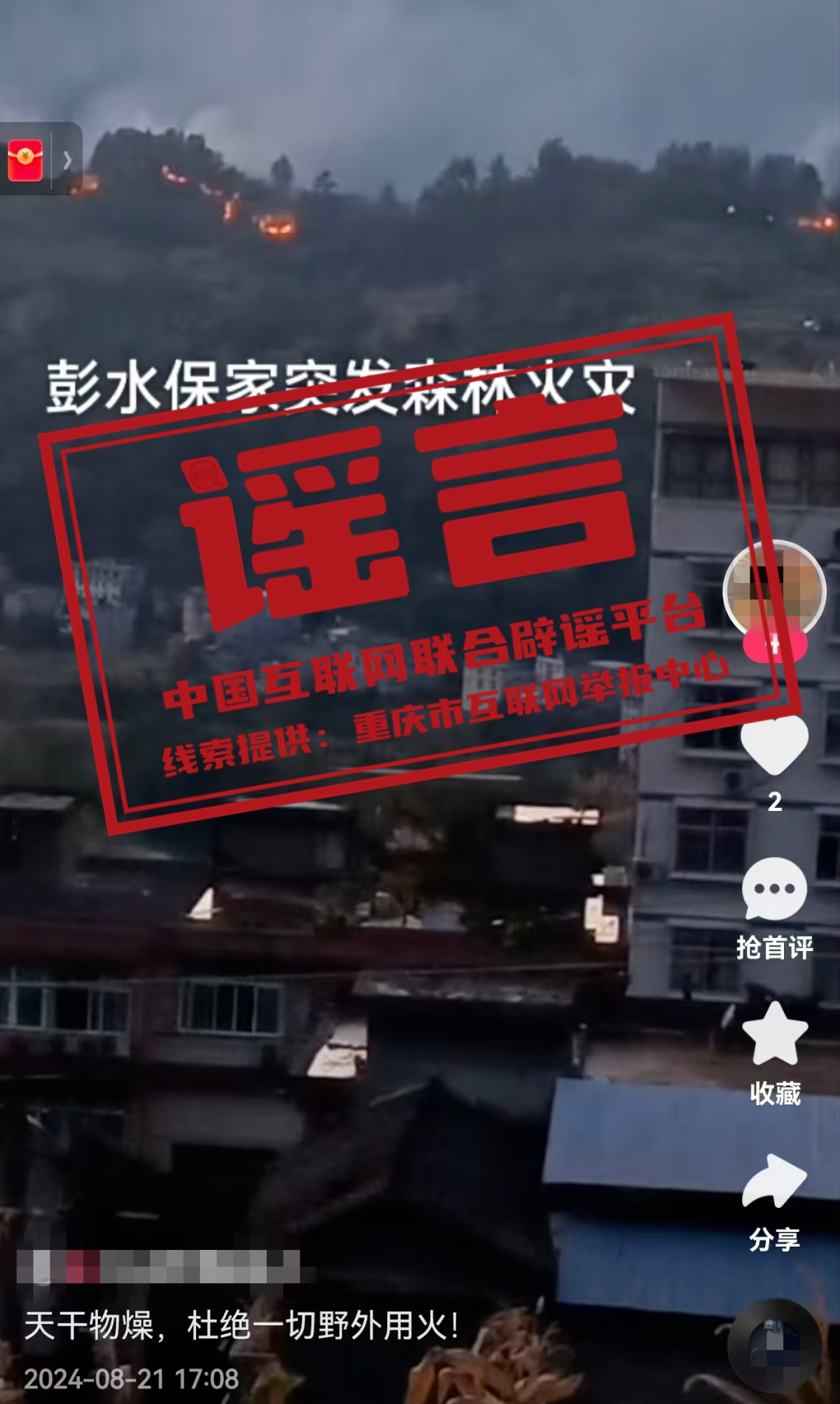 真相:8月21日,某網(wǎng)民發(fā)布視頻并配文“彭水保家突發(fā)森林火災(zāi)”,引發(fā)關(guān)注。經(jīng)屬地網(wǎng)信部門核實,重慶彭水近期未發(fā)生此類事件,網(wǎng)傳信息系謠言。目前,謠言線索已轉(zhuǎn)交相關(guān)部門對造謠者進(jìn)行進(jìn)一步調(diào)查處置。(來源:@重慶辟謠)