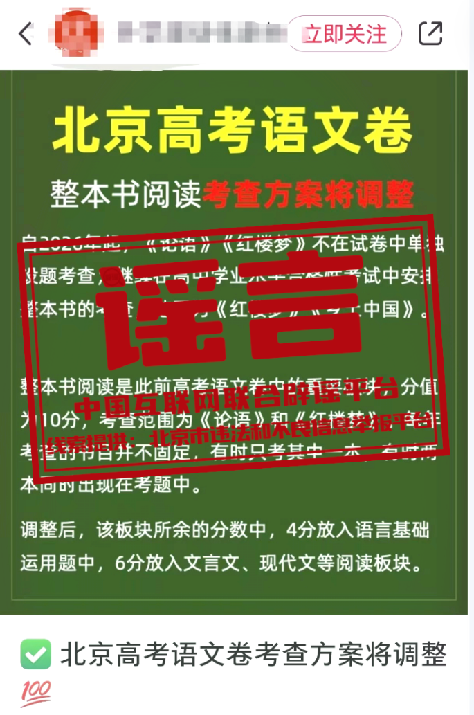 真相:近日,關(guān)于“北京高考語文學(xué)科整本書閱讀考查方式調(diào)整”的消息在網(wǎng)絡(luò)上傳播,引發(fā)社會發(fā)注。對此,北京教育考試院發(fā)表聲明稱:該網(wǎng)傳內(nèi)容為不實信息。北京教育考試院沒有發(fā)布對北京高考語文整本書閱讀考查方式調(diào)整的相關(guān)內(nèi)容,北京高考語文2025、2026年的學(xué)科考試內(nèi)容保持穩(wěn)定,范圍不變。(來源:北京市違法和不良信息舉報平臺、“首都教育”微信公眾號)
