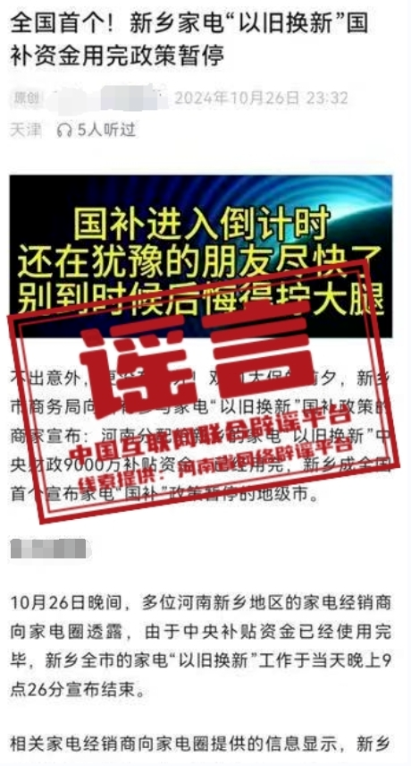 謠 言  河南新鄉(xiāng)家電“以舊換新”國家補(bǔ)貼資金用完、政策暫停?