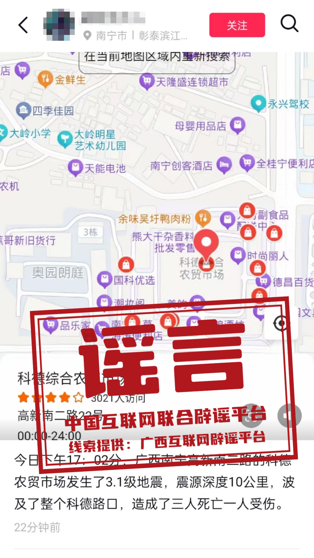 真相:2月12日,有網(wǎng)民在某短視頻平臺發(fā)文稱“今日下午17:02分,廣西南寧高新南二路的科德農(nóng)貿(mào)市場發(fā)生了3.1級地震?!苯?jīng)向有關(guān)部門核實(shí),此信息為謠言。據(jù)廣西地震臺網(wǎng)和南寧市地震監(jiān)測中心數(shù)據(jù)顯示,南寧市及其鄰區(qū)無有感地震發(fā)生,亦無震情和災(zāi)情信息反饋。目前,謠言線索已轉(zhuǎn)交相關(guān)部門對造謠者進(jìn)行進(jìn)一步調(diào)查處置。(來源:“廣西互聯(lián)網(wǎng)違法和不良信息舉報(bào)”微信公眾號、南寧市互聯(lián)網(wǎng)舉報(bào)·辟謠平臺)