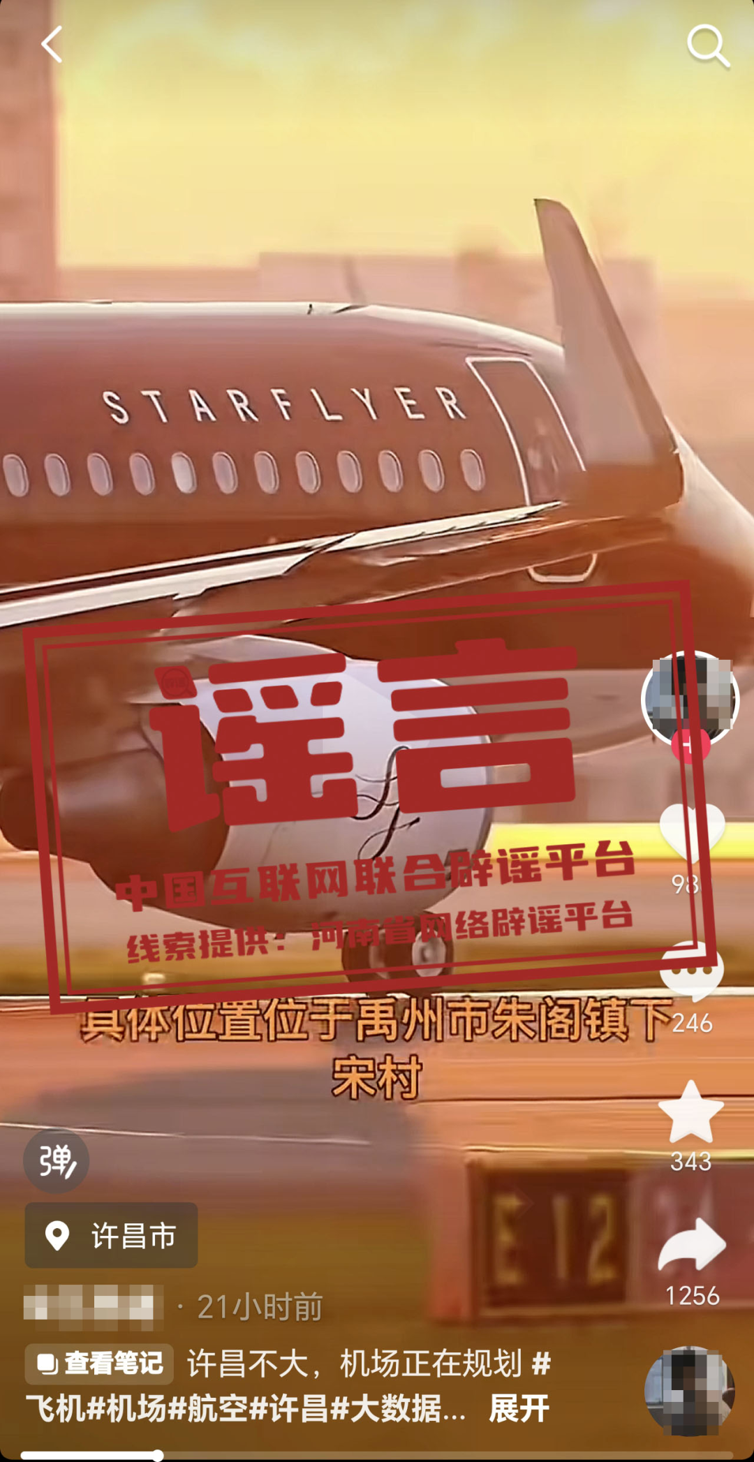謠 言  河南許昌已明確通用機(jī)場(chǎng)的選址和投資金額?