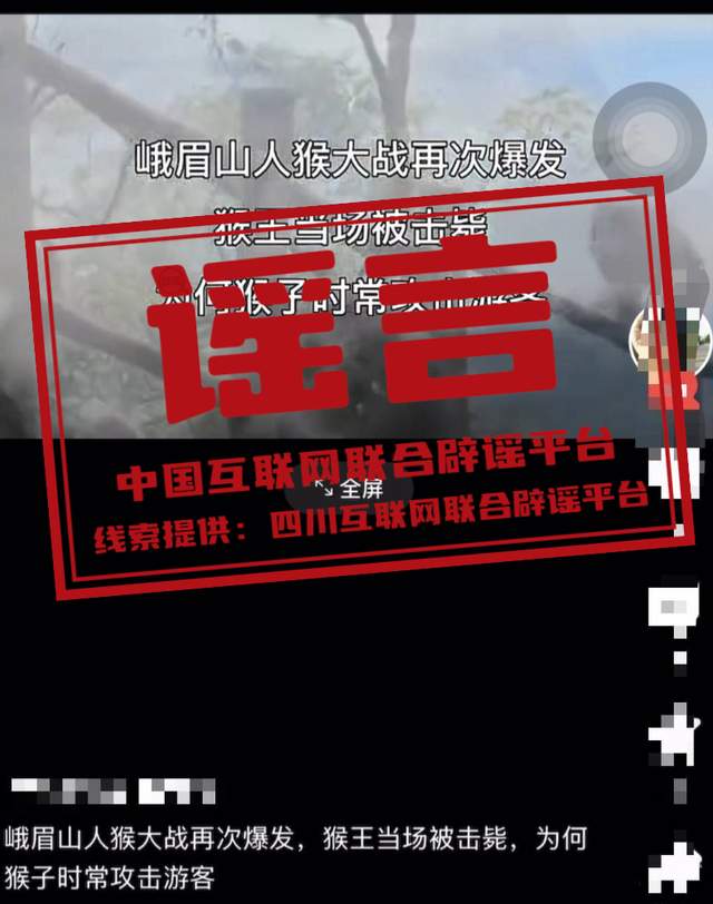 詳情:近日,有關“峨眉山人猴大戰(zhàn)再次爆發(fā),猴王當場被擊斃”的消息在網(wǎng)絡上傳播,引發(fā)社會關注。經(jīng)核實,該消息為謠言。網(wǎng)傳視頻是將多地畫面進行剪輯拼接而成,AI生成痕跡較重,且視頻中被擊斃的“猴王”并不是峨眉山藏酋猴。實際上,“峨眉山人猴大戰(zhàn)猴王被斃”的謠言多年前曾出現(xiàn),當時景區(qū)已經(jīng)聯(lián)合森林公安等部門共同辟謠。(來源:四川互聯(lián)網(wǎng)舉報辟謠平臺)