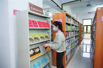 中山市桂山中學(xué)禁毒教育知識(shí)專柜前,工作人員正在整理禁毒圖書。 本報(bào)記者 易承樂(lè) 攝