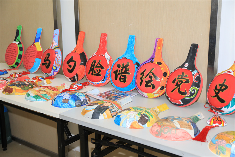 中國(guó)共產(chǎn)黨成立100周年標(biāo)識(shí)、井岡山勝利會(huì)師、南昌起義、嘉興游船上舉行的中共一大、萬(wàn)里長(zhǎng)征路……分享會(huì)現(xiàn)場(chǎng),刻畫了一個(gè)個(gè)黨史故事的木瓢排列成行,十分引人注目?!斑@是國(guó)家級(jí)非物質(zhì)文化遺產(chǎn)——馬勺臉譜。它是陜西的傳統(tǒng)民間藝術(shù),以馬勺作‘紙’,將社火臉譜以彩繪的形式繪制在上面?!瘪R勺臉譜傳承者、沙溪中學(xué)老師馬世杰介紹。作為一名美術(shù)老師,馬世杰通過(guò)民間藝術(shù)的再創(chuàng)新來(lái)引導(dǎo)學(xué)生學(xué)習(xí)黨史,在他的帶領(lǐng)下,沙溪中學(xué)的學(xué)生將南粵特色、中山元素、國(guó)風(fēng)動(dòng)漫等融入馬勺臉譜的創(chuàng)作中。“繪制黨史故事前,我們查閱了大量資料,并向?qū)<覍W(xué)者請(qǐng)教,在創(chuàng)作中引導(dǎo)學(xué)生們了解、學(xué)習(xí)黨史。”